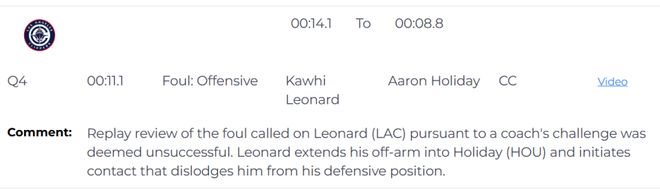 距离比赛结束还有11.1秒时,莱昂纳德被吹对阿隆-霍勒迪的进攻犯规,裁判报告表示:经教练挑战启动的、针对莱昂纳德犯规判罚的回放复审,最终判定挑战无效。回放显示,莱昂纳德在进攻过程中,将非持球手臂顶向霍勒迪 ,主动制造身体接触,导致霍勒迪被撞离合法防守位置。这确实是进攻犯规。