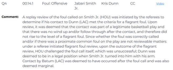 需要说明的是,在裁判主动发起的恶意犯规复审流程中,原始犯规判罚是否准确以及该回合是否存在近似普通犯规这两项内容,均不属于可复审范畴。因此,在恶意犯规复审结果出炉后,火箭队随即对原始犯规判罚本身提出挑战,但最终挑战失败。裁判认定,当小史密斯转身持球、手臂架在邓恩身上时,邓恩处于合法防守位置。